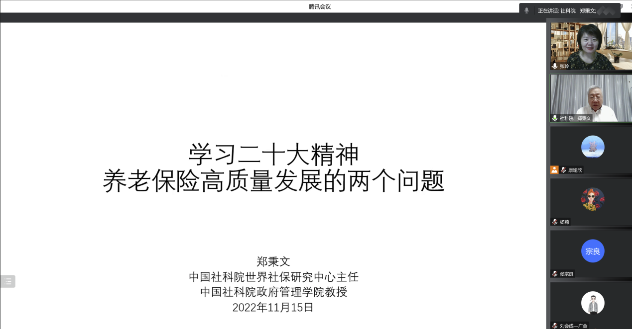 11月15日,全国政协委员、中国社会科学院政府管理学院郑秉文教授做客我校“国家金融学大讲坛 ”(第六讲),做了主题为“学习二十大精神,养老保险高质量发展的两个问题”的精彩报告。本次报告由我校必赢线路检测中心张玲教授主持,报告吸引了大量在校内本科生、研究生、教师的积极参与,来自全国数十所高校的师生以及金融机构从业人员近三百人参加了此次报告。