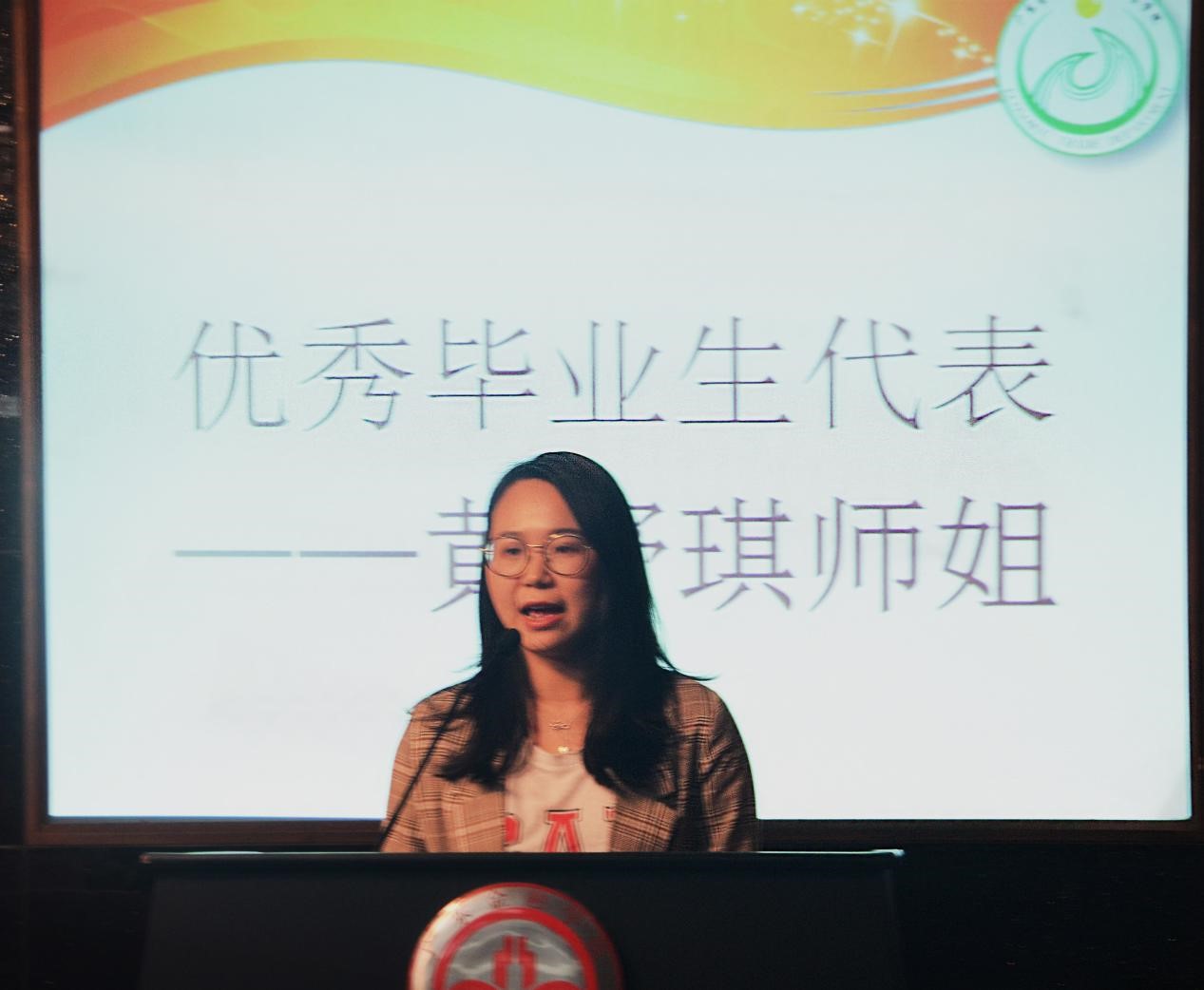 紧接着发言的是黄舒琪师姐。黄舒琪师姐是我院15级国贸应届生,曾任经贸校友联络办公室副主任、雀巢公司暑假实习生,现在是强生医疗招管培生。