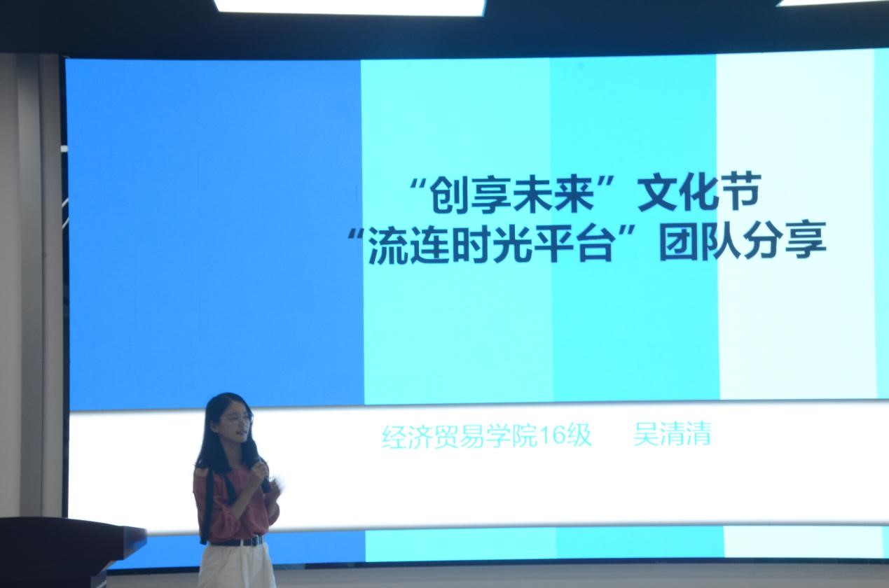 本次开幕式的最后环节由往年曾获得省挑战杯银奖的“八仙过海”优秀团队的队伍代表吴清清师姐做分享。吴清清师姐上台为我们分享她的参赛经历和个人经验。吴清清师姐分别从团队、项目方案、项目策划书、还有比赛所得这四个方面去讲述。并且最后她还告诉我们只要想做就勇敢地去尝试,光有想法而不去把它做出来,那它永远只会是一个想法。