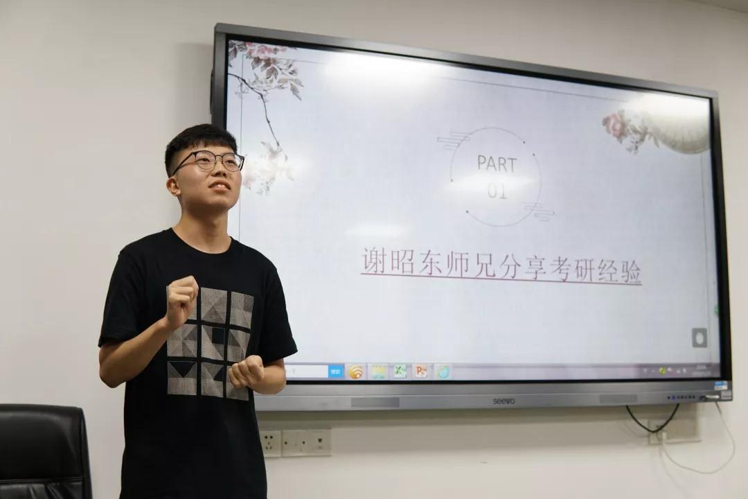 然后是谢昭东师兄给我们介绍经验,他着重指出英语与数学的重要性并分享了该两门课的备考技巧,建议即将要考研的同学可以根据自身的英语、和数学水平来如何科学学习以及规划备考时间。同时,师兄也向我们详细介绍了备考时间的规划以及学习的方法,希望我们能选定追逐的目标,适当取舍,脚踏实地走好每一步。