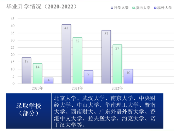 二十多年来共为社会输送8000多名“好用、顶用、耐用”型专门人才,毕业生在金融、贸易等行业拥有明显的就业竞争力。历届毕业生的就业大部分集中在粤港澳大湾区地区,其中,广州、深圳、佛山、东莞占比超过80%,也有在美国、欧洲、中东等国家和地区发展。校友们遍布在银行、外贸、跨境电商等行业,不少已经成为业务骨干,走上领导岗位。近年来,大概有10%左右的毕业生会考取境内外研究生,录取的学校包括北京大学、南京大学、武汉大学、中山大学、香港中文大学、英国曼彻斯特大学等国内外名校。