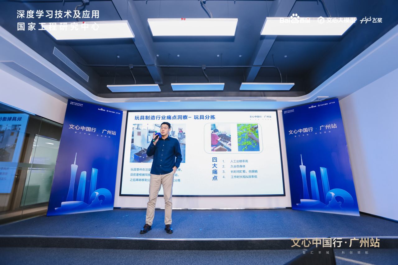 百度飞桨(广州)人工智能产业赋能中心副主任、广东粤桨产业科技有限公司CTO陈云峰现场分享了赋能中心的产业实践案例,其重点介绍的玩具分拣、乒乓球瑕疵检测等案例,均依托飞桨深度学习平台及其丰富的模型套件与先进技术,成为行业AI转型的典范,为各行各业积极探索AI大模型落地提供了参考。