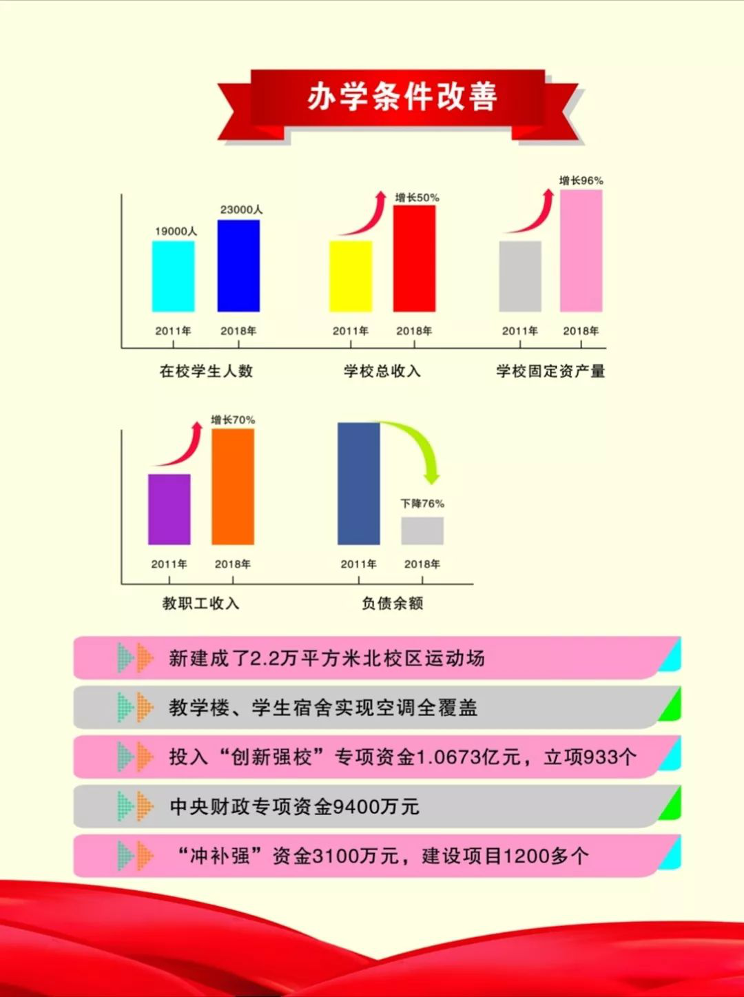 近年来,我校在各方面都取得可喜可贺的成绩。下面为大家“数”说学校七年发展(2011—2018)。