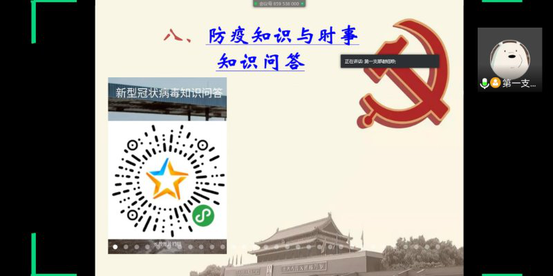 大会进入第三项议程,全体党员填写“新型冠状病毒知识问答”问卷,进一步了解新冠肺炎的相关防控知识,提高安全意识。第四项议程,全体党员观看了习近平总书记给北京大学援鄂医疗队全体“90后”党员的回信视频,学习90后新时代青年勇于担当的精神,并将总书记的勉励和希望转化为前进的动力,争做能担大任的新时代中国青年,让青春在党和人民最需要的地方绽放绚丽之花。