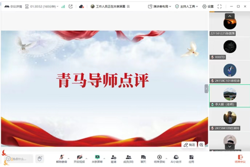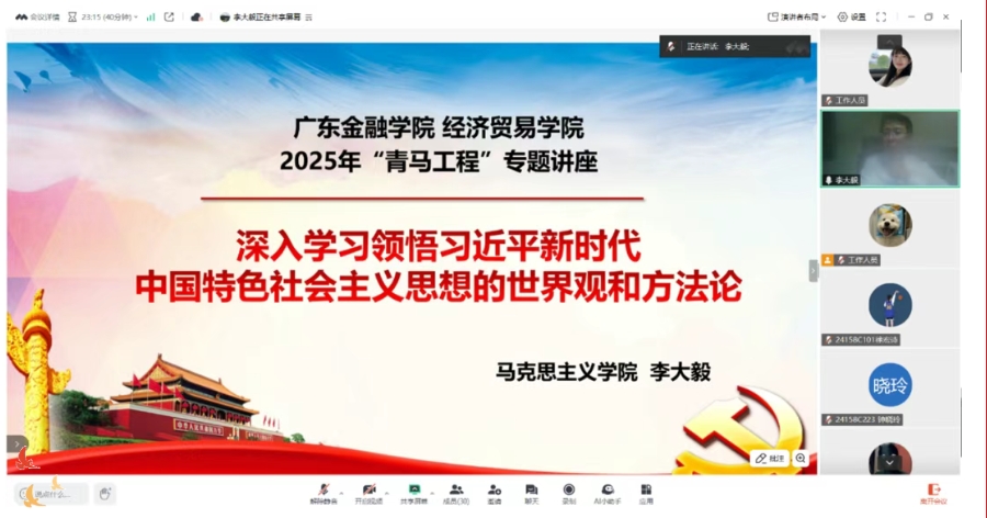 4月13日,线上开班仪式拉开序幕,主持人朱晁辰宣布青马工程正式开班,明确了青马工程的总体目标与活动意义。青马导师李大毅为学员们带来了“深入学习领悟习近平新时代中国特色社会主义思想的世界观和方法论”专题讲座,引导学员们以自信自立的态度面对生活中的各种困难,坚定信念,勇往直前,以胸怀天下的情怀,关心国家大事和全球发展,积极传播正能量。