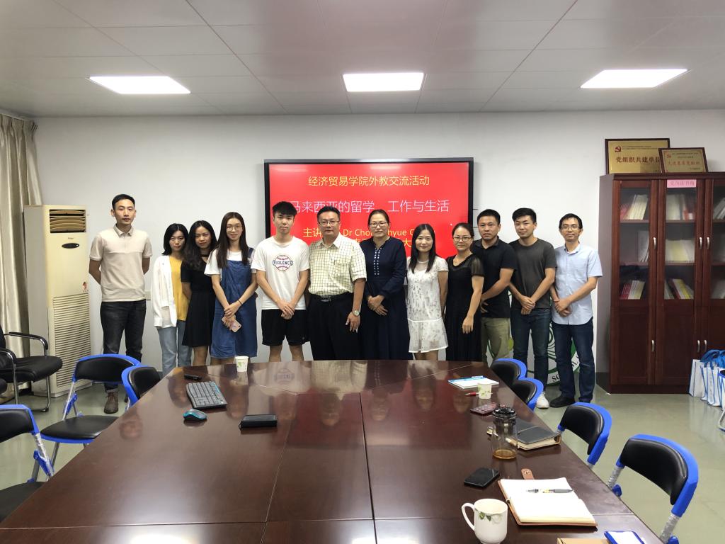 2019年10月24日下午二点半至四点半,必赢线路检测中心外教工作小组邀请马来西亚拉曼大学的Chong Shyue Chuan (PhD)博士在必赢线路检测中心会议室为师生进行了一场精彩的讲座。 Chong Shyue Chuan (PhD)博士是拉曼大学会计管理学院经济系副教授,曾任经济系系主任,现任拉曼大学质量保证与审计委员会主席,拉曼大学参议院议员等职务,主要研究马来西亚经济与贸易、“一带一路”等。