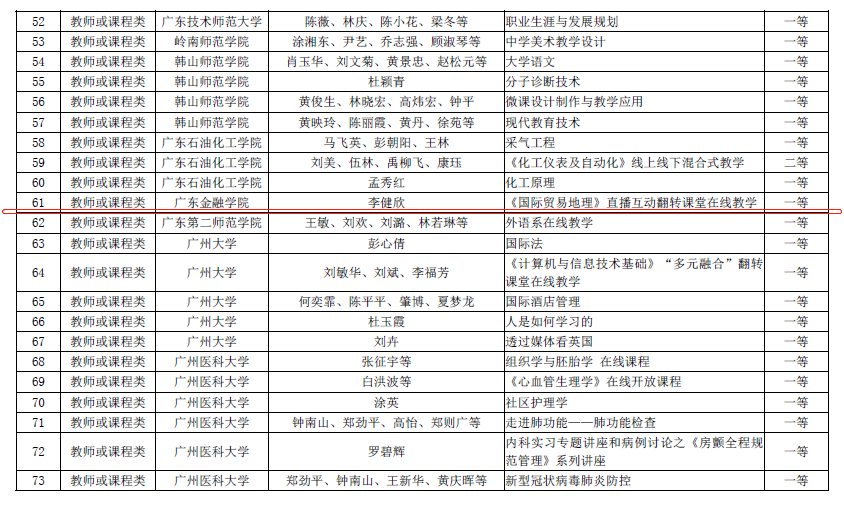 李健欣老师的“《国际贸易地理》直播互动翻转课堂在线教学”案例,获得广东省本科高校在线开放课程指导委员会第二批“疫情阶段在线教学优秀案例”一等奖。