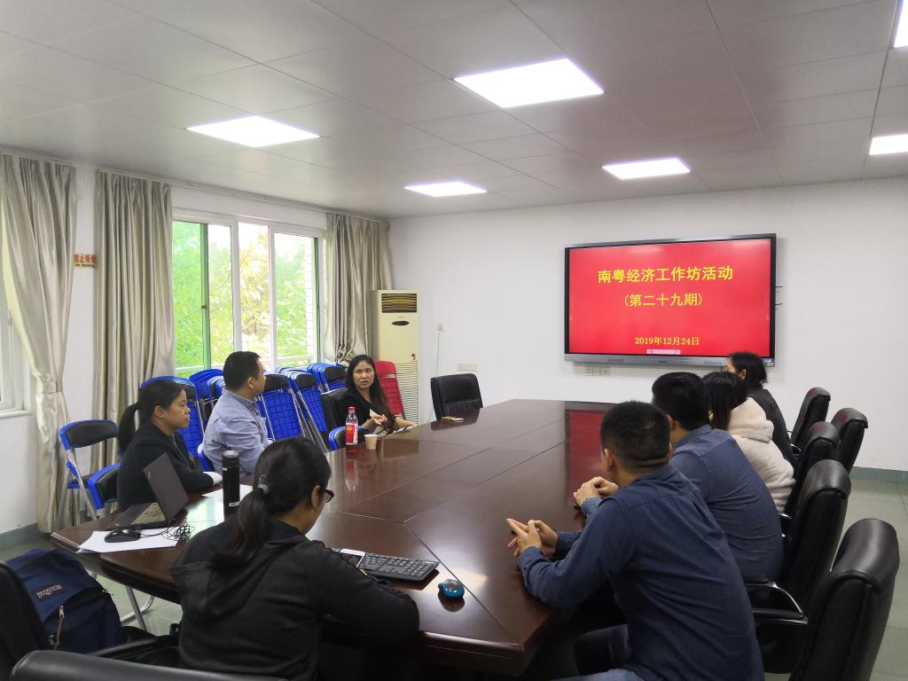 2019年12月24日上午,第二十九期南粤经济工作坊座谈会在必赢线路检测中心会议室2317顺利举行。本次会议主题为:审读国家课题,主要由李文秀副院长主持,汤子隆老师做点评,张华(大)、李光德、林小玲等老师拿出自己撰写的课题现场交流,其它老师也参加了本次工作坊活动。